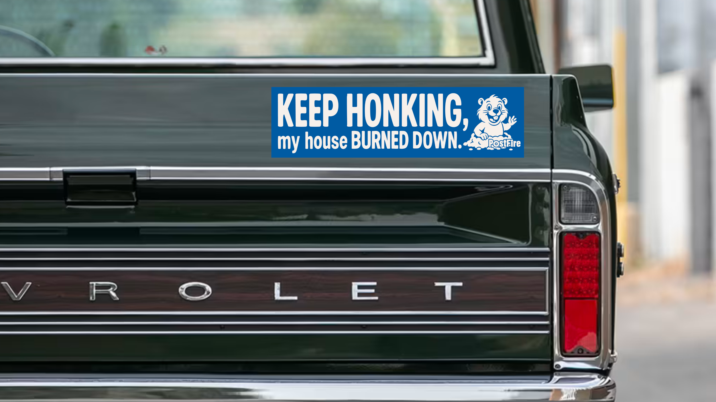 *These decals are meant for fire survivors — a way to honor loss, resilience, and shared humor. If you haven’t experienced a fire, we ask that you gift your bumper sticker to a survivor in your life.